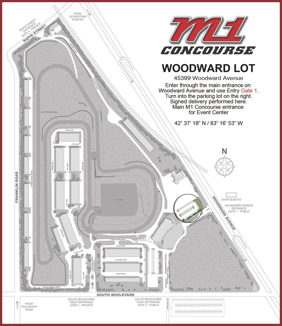 Enter through the main entrance on Woodward Avenue and use Entry Gate 1 (circled on diagram). Turn into the parking lot on the right. There will be event staff at the entrance to guide attendees.
